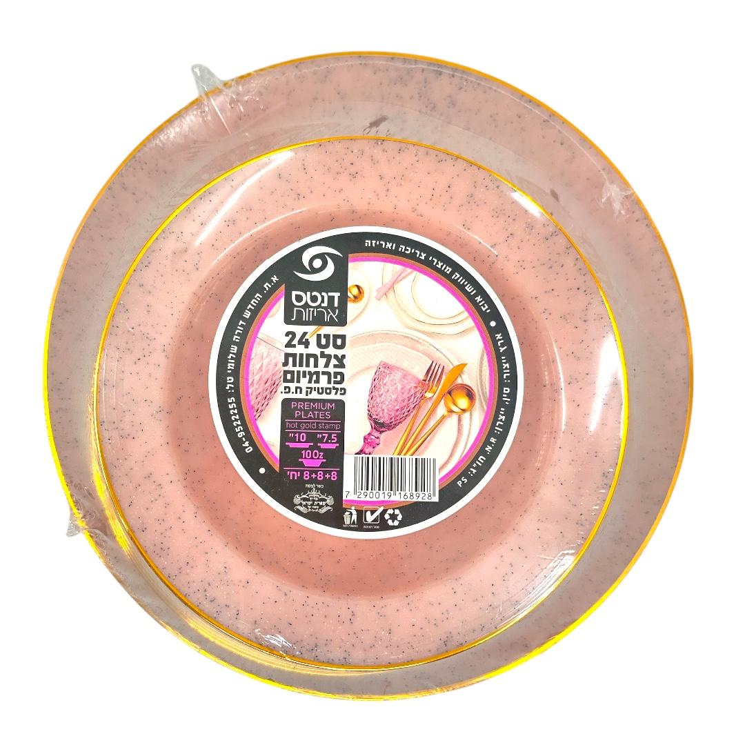 דף הבית / חד פעמי ואריזות / צלחות חד פעמי / סט 24 צלחות פרמיום מעוטרות מפלסטיק – ורוד פנינה