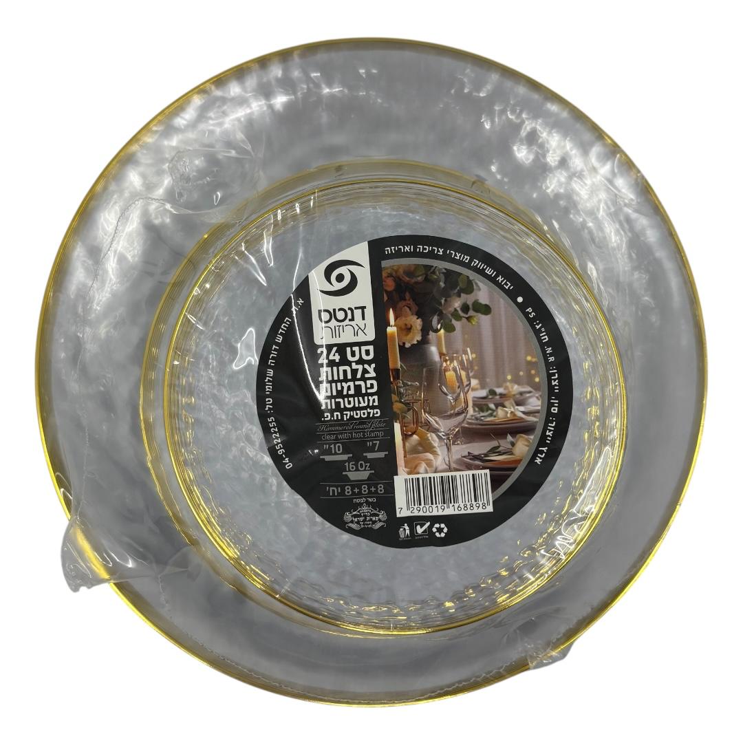 דף הבית / חד פעמי ואריזות / צלחות חד פעמי / סט 24 צלחות פרמיום מעוטרות מפלסטיק – שקוף