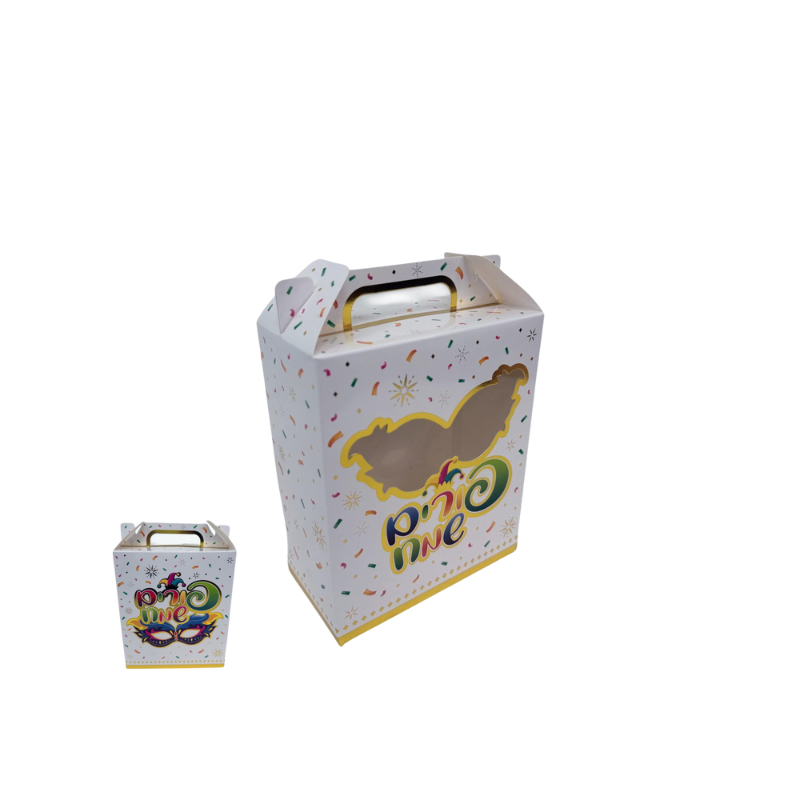 קופסת קרטון + חלון 18/15/8 ס”מ – פורים שמח מסכה